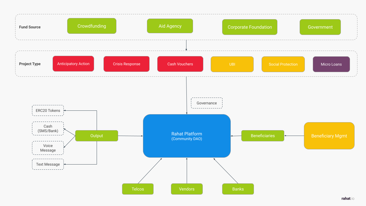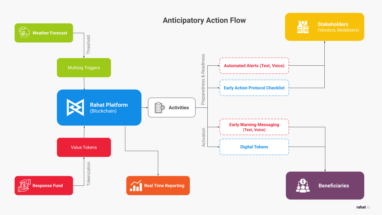 Rahat is a comprehensive AA project management solution that integrates blockchain technology with real-time data sources, communication modules, and Cash and Voucher Assistance (CVA) systems. The platform provides immutable transaction recording, automated trigger mechanisms, and decentralized fund management for transparent humanitarian aid distribution.